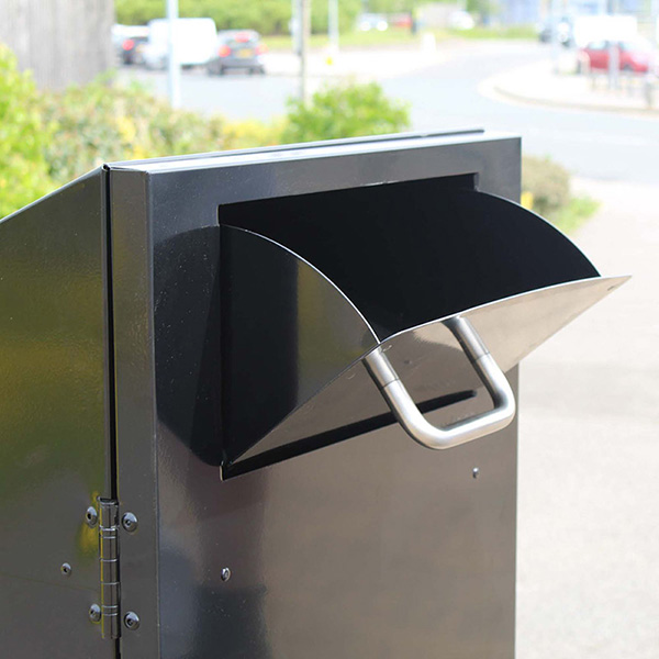 The Artemis Wheelie Bin Cover is manufactured from durable galvanised steel with a twin ball bearing hinged front opening door and slam lock. This stylish cover features a sloped lid, designed to allow rainwater to run off and prevent any rubbish from being left on top of the unit. A pull down chute to the front helps to contain unwanted odours, with a stainless steel handle that makes opening easy and hygienic.