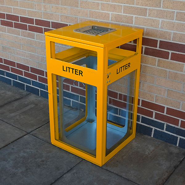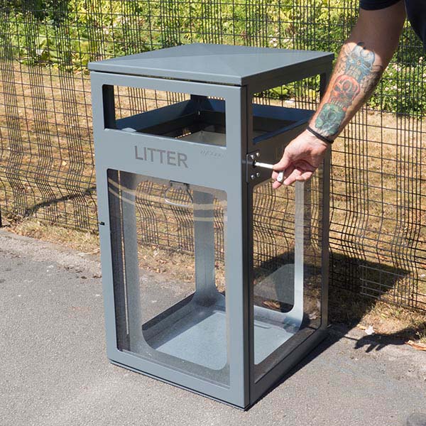 This Security Litter Bin is manufactured from durable, British bought galvanised steel with transparent polycarbonate panels to all sides and four large apertures to maximise litter collection.