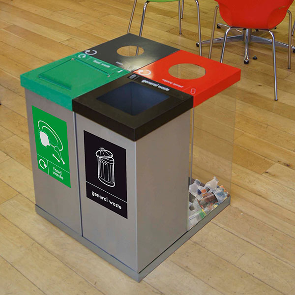Choose from a steel or plastic transparent body with different lid colour options. A4 vinyl artwork can be applied to advertise the waste stream for each unit, and locking lids and lid flaps can be installed for improved security.