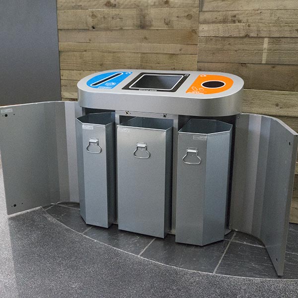 The Torpedo Triple is available with your choice of waste stream, which comes as standard with WRAP/Recycle Now branding to the aperture fascia plates. However, if you are looking to personalise your recycling bin with logos or artwork, we do offer a full in-house bespoke design service.