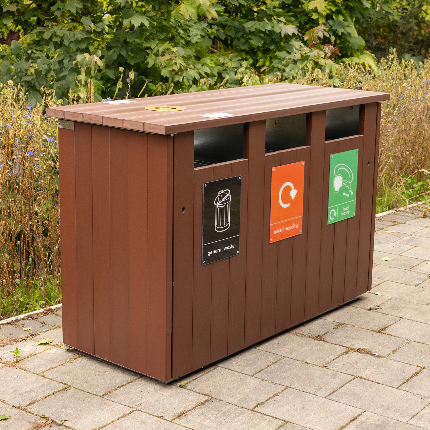 This triple capacity litter bin comes in two sizes; a slimline double which offers 180 litres, split evenly between three waste streams and a 336-litre capacity which offers generous collection across the three streams.