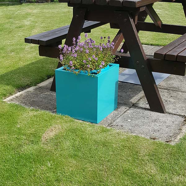 This Turquoise Medium Square Flower Planter is designed with gardens and landscape areas in mind. With a 30-litre capacity and a width and depth of 320mm, this product is manufactured from premium quality 0.8mm hot-dipped galvanised steel and has a distinct turquoise colouring to match garden sheds, fences or decking.