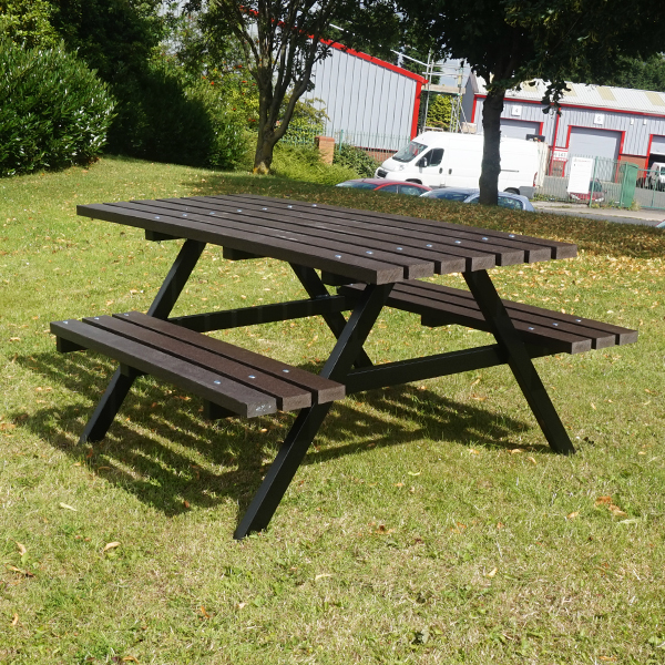 This recycled plastic picnic table is manufactured using a premium quality, 2mm galvanised steel box section frame, which is expertly primed and powder coated to offer maximum corrosion resistance; it is then topped with recycled plastic slats. Our skilled craftsmen finish every product by hand and each individual item is quality checked before leaving our factory to ensure it arrives in perfect condition.